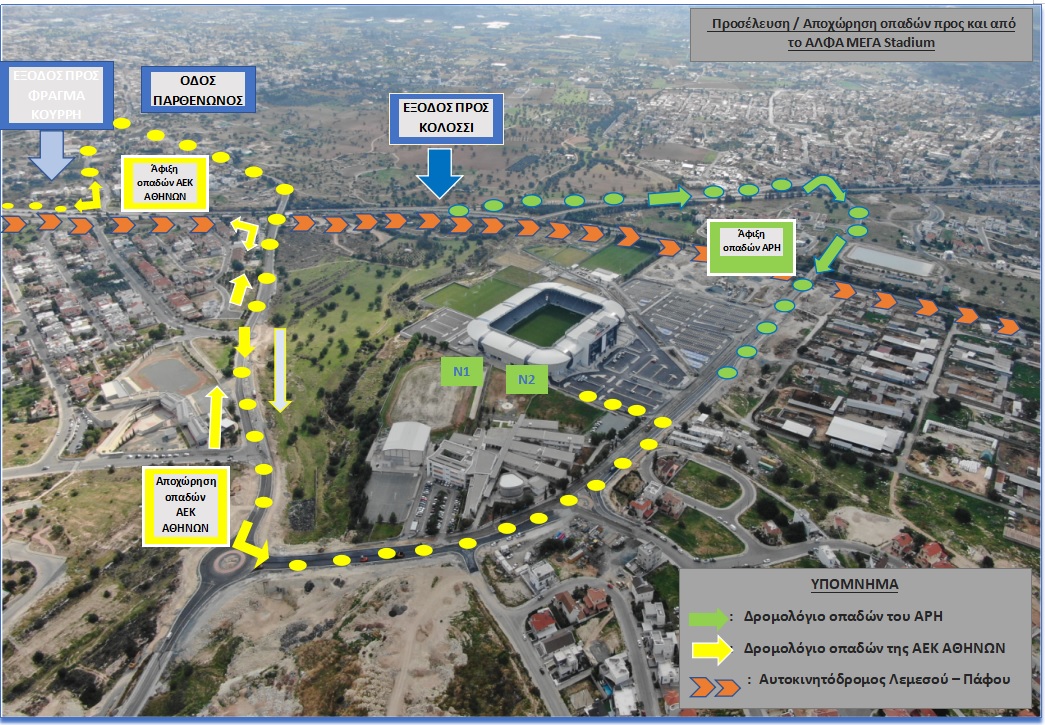 - Για την ομαλή προσέλευση και αποχώρηση των οπαδών της ΑΕΚ ΑΘΗΝΩΝ προς και από το στάδιο, καλούνται να κατευθυνθούν προς ΑΛΦΑΜΕΓΑ Stadium, δια μέσου του αυτοκινητόδρομου {Α6} προς Πάφο, έξοδο προς Φράγμα Κούρρη και στη συνέχεια μέσω της οδού Παρθενώνος (1ο στρίψιμο δεξιά). Ακολούθως από τη 1η έξοδο {αριστερά} του νέου Κυκλικού Κόμβου, κατεύθυνση προς το γήπεδο.