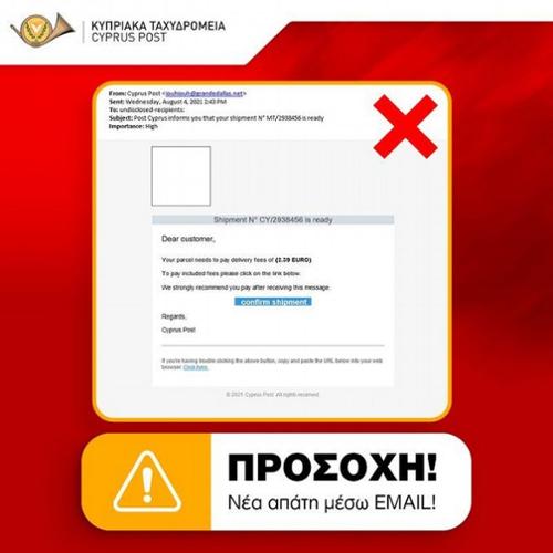 Έξαρση παρουσιάζει το φαινόμενο αποστολής μαζικών μηνυμάτων σε πολίτες, μέσω των οποίων ενημερώνονται ότι δήθεν έχουν πακέτο στα Κυπριακά Ταχυδρομεία και καλούνται να πιστοποιήσουν την παραγγελία του ταχυδρομικού δέματος.