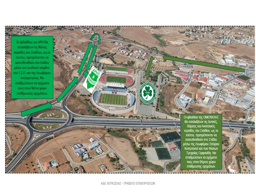 Σημειώνεται ότι απαγορεύεται η στάθμευση των οχημάτων στον νέο κυκλικό κόμβο του αυτοκινητόδρομου Λευκωσίας-Λεμεσού παρά το στάδιο ΓΣΠ και στα ερείσματα του αυτοκινητόδρομου όπως επίσης και στους δρόμους στην περιοχή του σταδίου. Οι παραβάτες θα καταγγέλλονται.