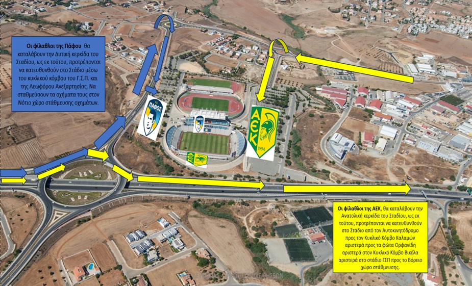 Οι φίλαθλοι της Πάφου θα καταλάβουν τη δυτική κερκίδα του σταδίου, ως εκ τούτου, προτρέπονται να κατευθυνθούν στο στάδιο μέσω του κυκλικού κόμβου του Γ.Σ.Π. και της Λεωφόρου Ανεξαρτησίας και να σταθμεύσουν τα οχήματα τους στον νότιο χώρο στάθμευσης οχημάτων.