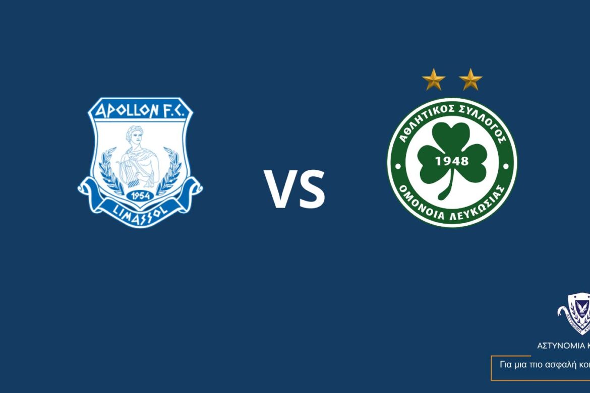 Η Αστυνομία, στα πλαίσια της συνεργασίας της με το κοινό, καλεί όλο το φίλαθλο κόσμο, που θα παρευρεθεί τη Κυριακή 23.11.2025 και ώρα 19:00 στο στάδιο ΑΛΦΑΜΕΓΑ στη Λεμεσό στα πλαίσια της 11ης Αγωνιστικής του Πρωταθλήματος CYPRUS LEAGUE by STOIXIMAN, μεταξύ των ομάδων ΑΠΟΛΛΩΝ – ΟΜΟΝΟΙΑ, να εκδηλώνεται με αθλητοπρέπεια και σεβασμό.