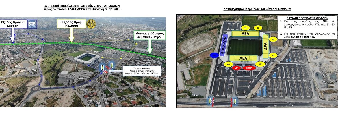 Η Αστυνομία Κύπρου, στο πλαίσιο της συνεργασίας της με το κοινό, καλεί όλο το φίλαθλο κόσμο, που θα παρευρεθεί την Κυριακή 30.11.2025 και ώρα 19:00, στον ποδοσφαιρικό αγώνα για το Παγκύπριο Πρωτάθλημα μεταξύ των ομάδων ΑΕΛ – ΑΠΟΛΛΩΝ, να εκδηλώνεται πάντοτε με αθλητοπρέπεια και σεβασμό προς την ίδια του την ομάδα.