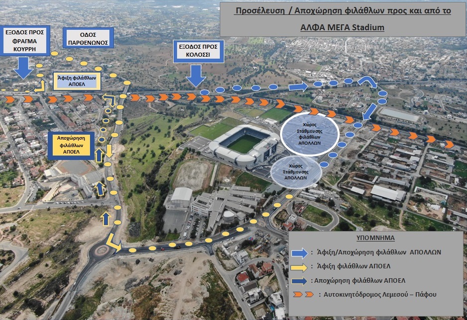 Για την ομαλή προσέλευση και αποχώρηση τους προς και από το στάδιο, οι οπαδοί της ομάδας του ΑΠΟΕΛ καλούνται να κατευθυνθούν προς το ΑΛΦΑΜΕΓΑ Stadium, μέσω του αυτοκινητόδρομου προς Πάφο, να ακολουθήσουν την έξοδο προς Φράγμα Κούρρη και στη συνέχεια μέσω της οδού Παρθενώνος (1ο στρίψιμο δεξιά). Ακολούθως από την 1η έξοδο (αριστερά) του νέου κυκλικού κόμβου, να κατευθυνθούν προς το στάδιο.
